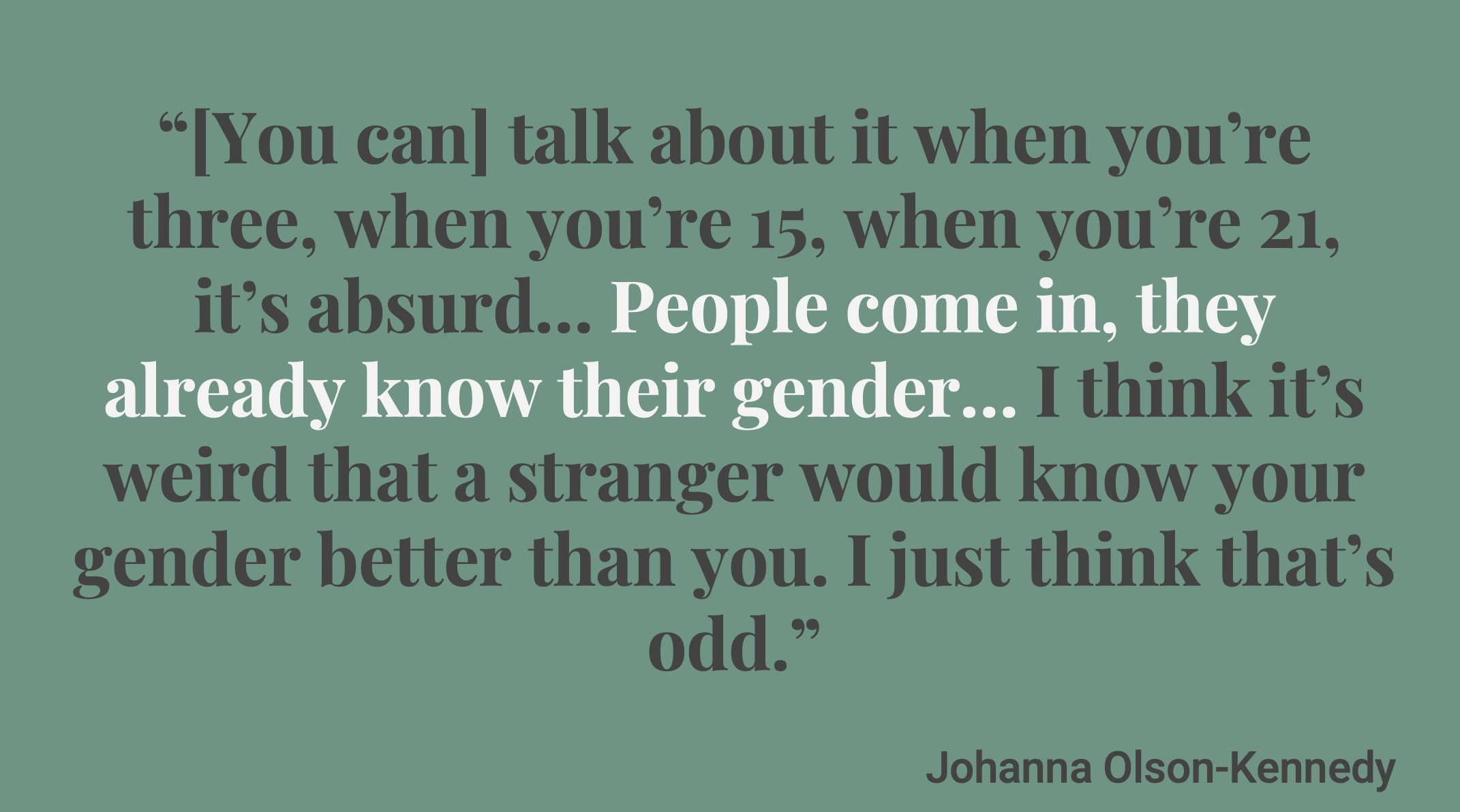 Laura was 15 when she began to question gender identity, and 18 when she identified as trans. The next year she took T, and had a double mastectomy at 20. At 22, she was diagnosed with PTSD, which helped her realize gender wasn’t the issue, and she detransitioned. She was simply a gender nonconforming woman, not someone who needed medicating.
