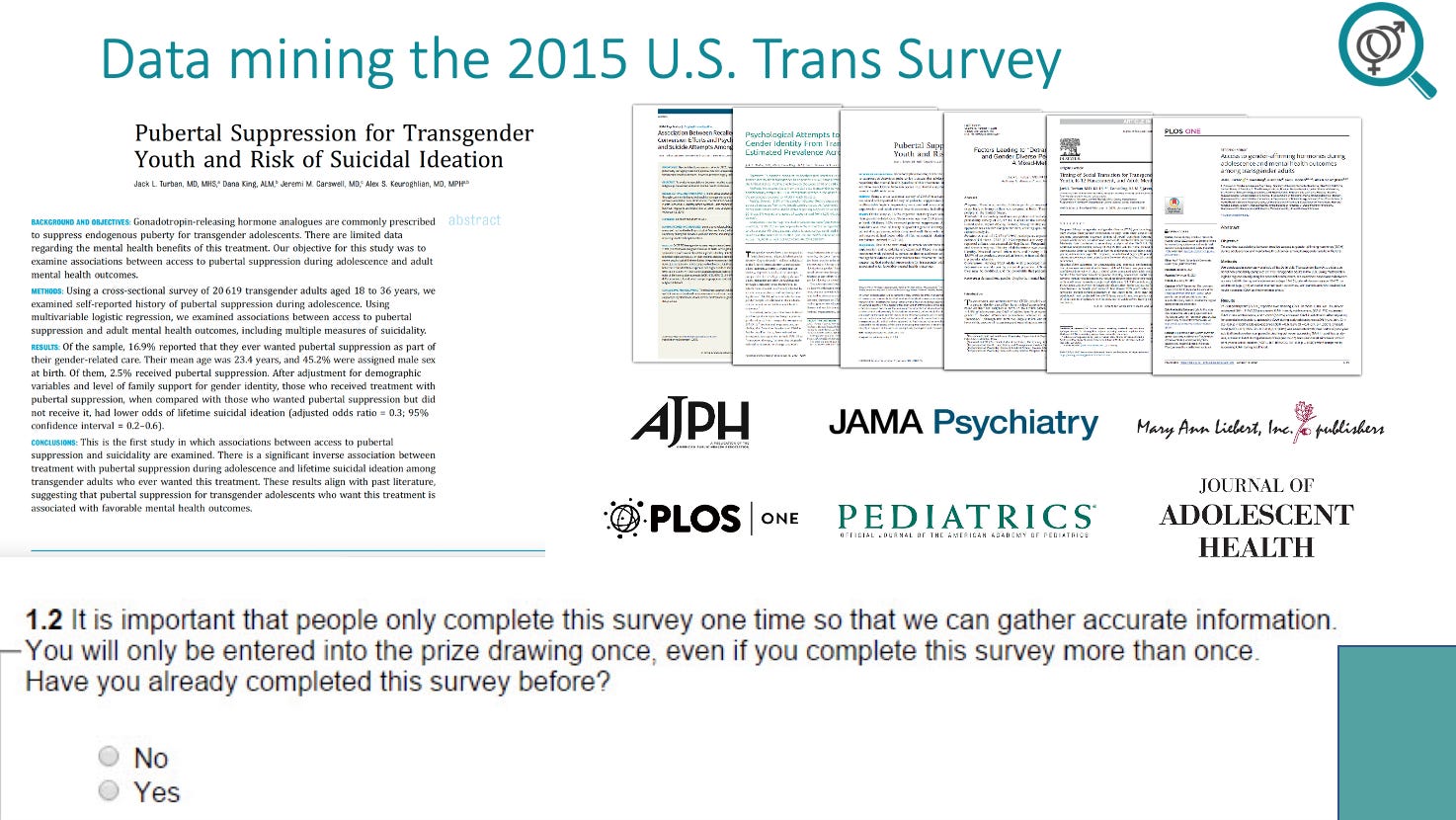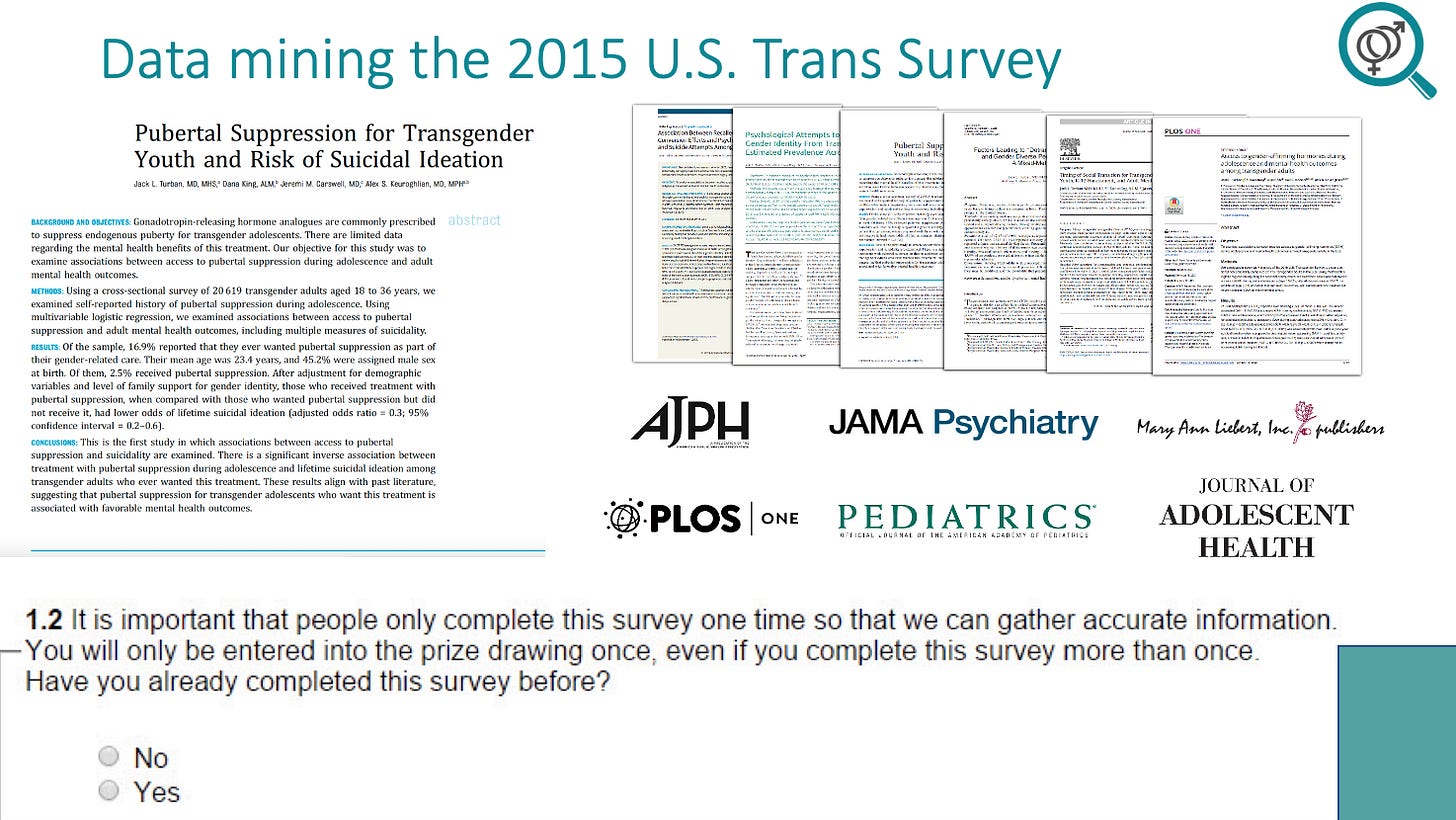 The anonymous retrospective survey of adults who still identify as transgender (used erroneously to assert a low detransition rate) showed adults who wanted and got puberty blockers had better mental health than those who wanted them and didn’t get them. But many said they were over 18 when they took them, which means they probably didn’t understand what puberty blockers were. And many were denied medical interventions if their mental health was already bad; it doesn’t mean not getting the drugs made them worse, but that they weren’t well enough to take them.
