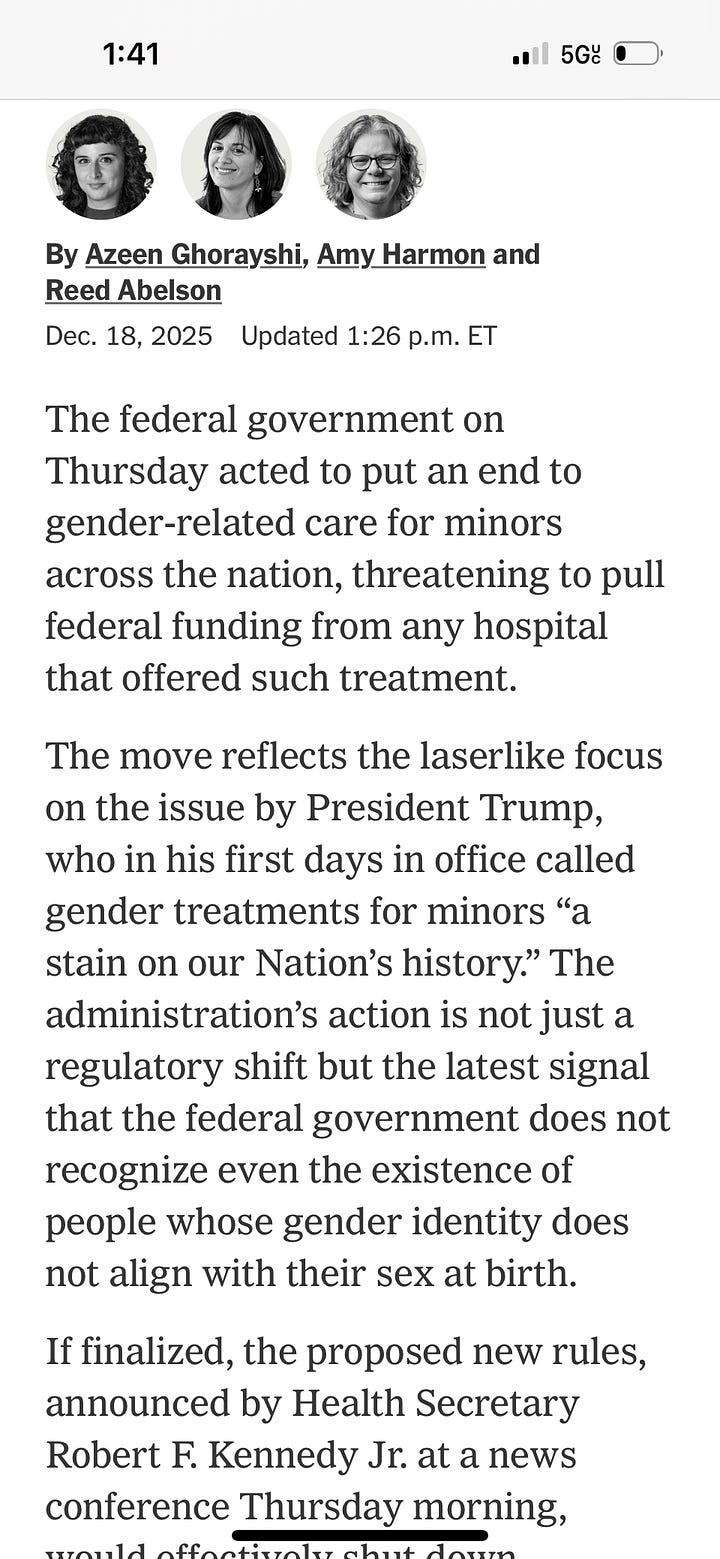 The announcements from RFK Jr and others revealed a multi-pronged deinstitutionalization of gender identity. The book I’ve been working on forever is about how those ideas got institutionalized and how pushback against them was censored, which allowed terrible things to happen. Most liberals don’t realize the sneaky ways gender identity, and the medicating of it, were institutionalized—by making gender dysphoria a disability, or amending the Affordable Care Act to consider the refusal of gender medicine a form of discrimination. There was a multi-pronged approach over more than a decade to quietly strongarm just about every American institution and profession into participating in the affirmation industry.