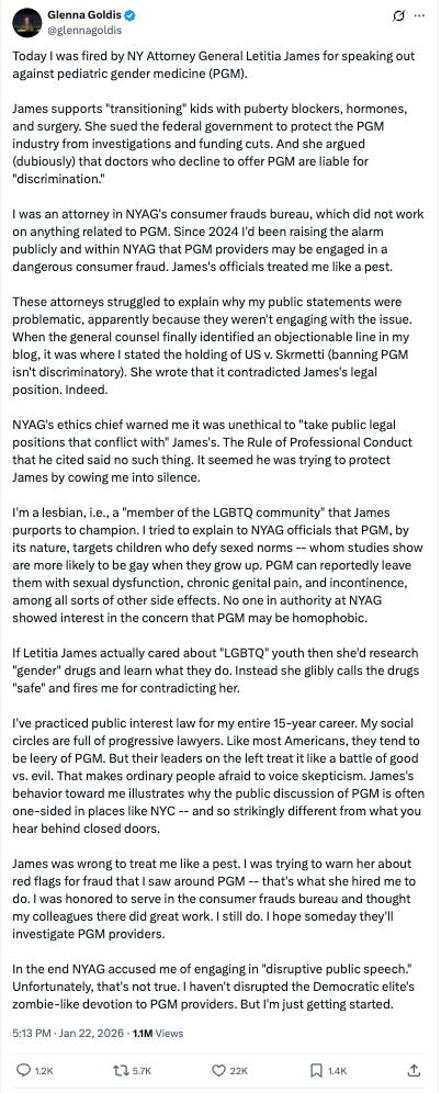 Maybe we now will. On January 22, lawyer Glenna Goldis posted on X that she’d been fired by New York Attorney General Letitia James for engaging in “disruptive public speech”—a post that had more than a million views at last perusal, and which has resulted in an article in The New York Post and offers from Megyn Kelly and others for more publicity.