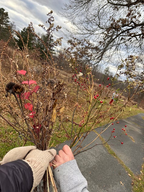 This was my brother’s idea many years ago, to have a winter bouquet Olympics and seek the beauty in winter colors and nature’s fallow days. Also a great trick for getting littles to walk outside in the cold without complaining!