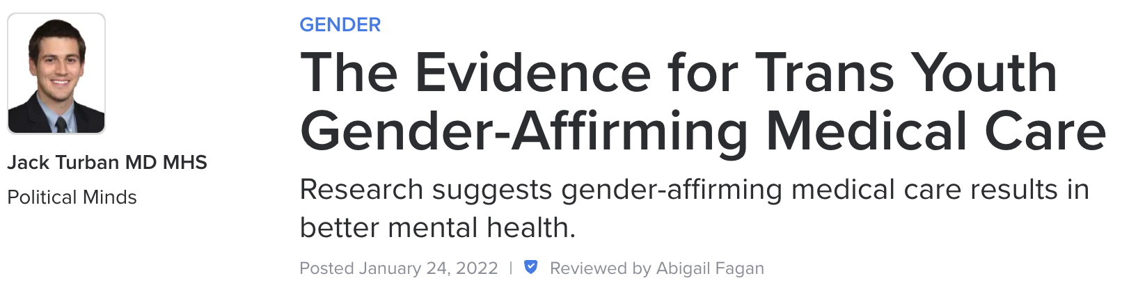 This piece says Abigail reviewed it, but I wanted to make sure you looked at what the studies actually assert. Most are a real mixed bag, and show both positive and negative outcomes. In addition, especially in studies of Dutch participants, those with other mental health problems would have been turned away—this is key to the Dutch protocol—and only people with higher-functioning mental health would have been gone through with medical interventions in the first place, so those who didn’t get gender-affirming medical interventions already had worse mental health.