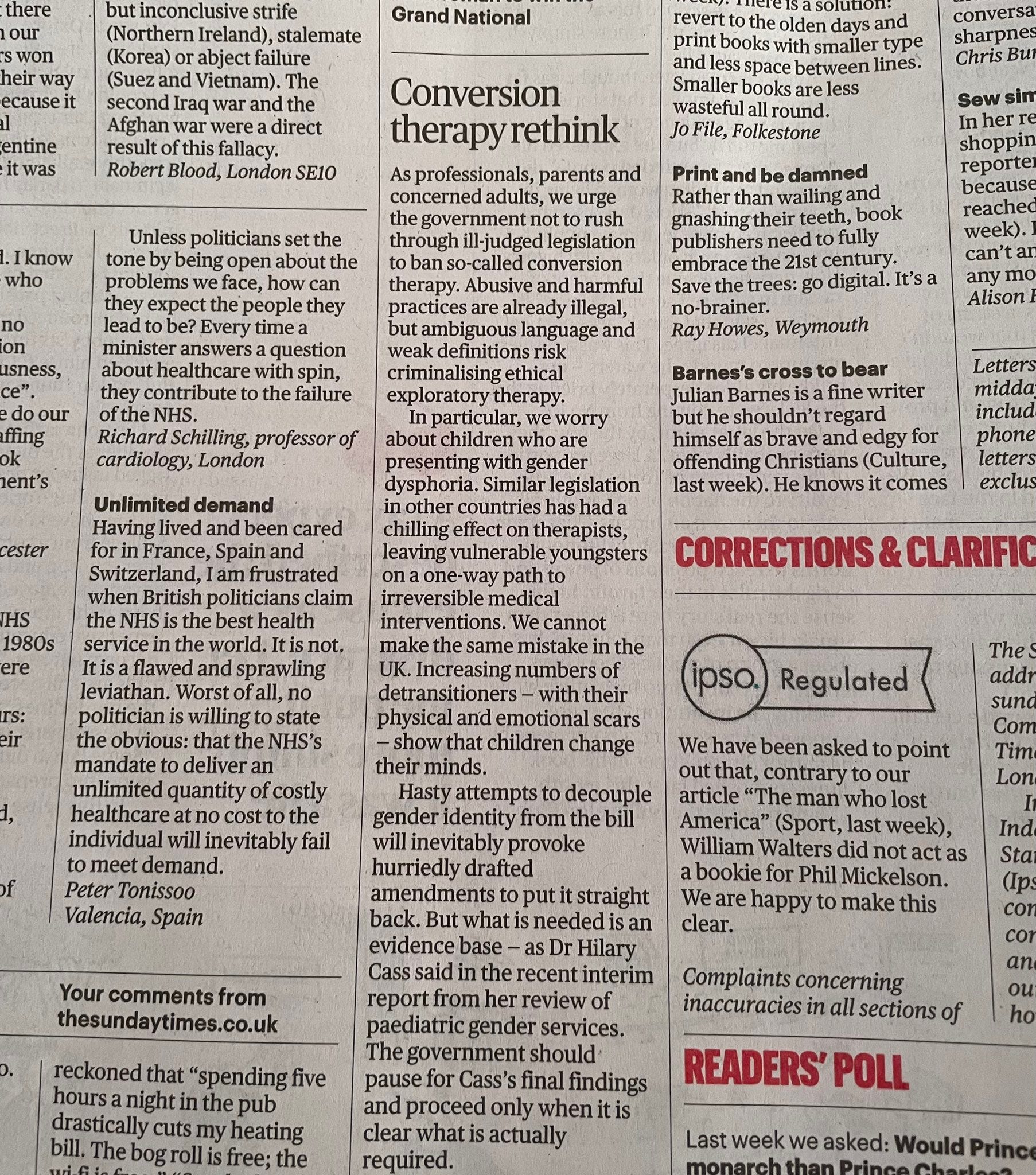Exploratory therapy doesn’t preclude medical intervention, but it helps someone suffering from gender dysphoria understand if it’s likely to help them or not. Today there’s an unprecedented epidemic of adolescent-onset gender dysphoric teens, studied only in Lisa Littman’s ROGD paper and chronicled in Abigail Shrier’s book Irreversible Damage. It’s unlikely that the research on the two types of gender dysphoria applies to them, just as previous studies about medical interventions for kids with childhood-onset gender dysphoria don’t apply. It’s not bigotry to ask how to best help suffering children, or to agitate for the least invasive options first. And exploratory therapy and conversion therapy are not the same thing.