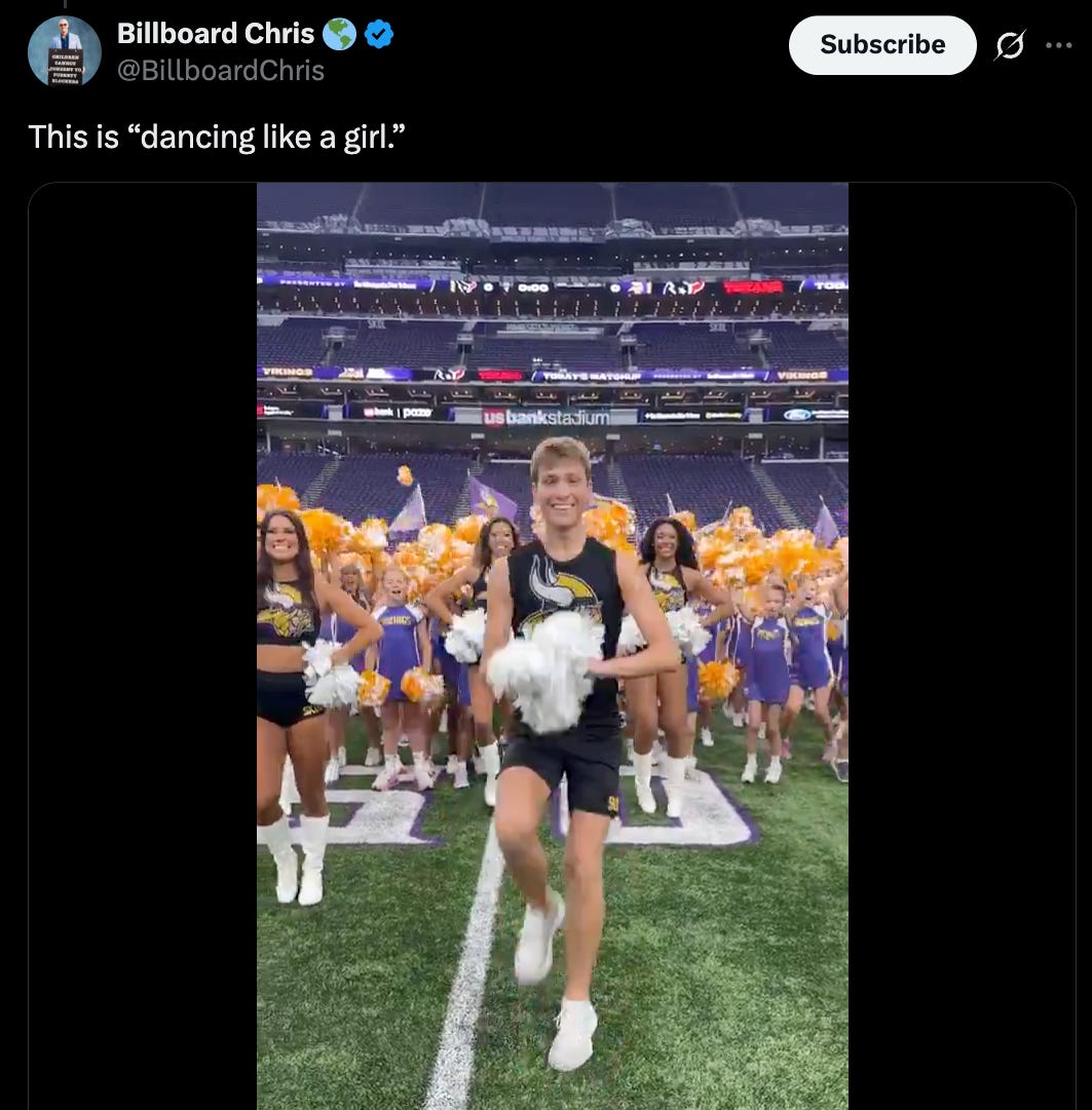 This week, my X feed has been dominated less by unlikely animal best friends—my favorite thing on the internet—and more by videos of male cheerleaders for the Minnesota Vikings, waving their pom-poms alongside their female compatriots. Or, more accurately: by unhinged reactions to those videos.