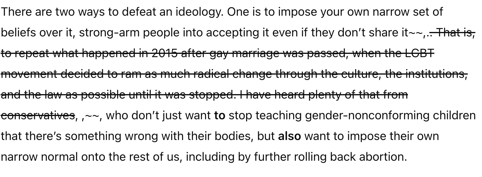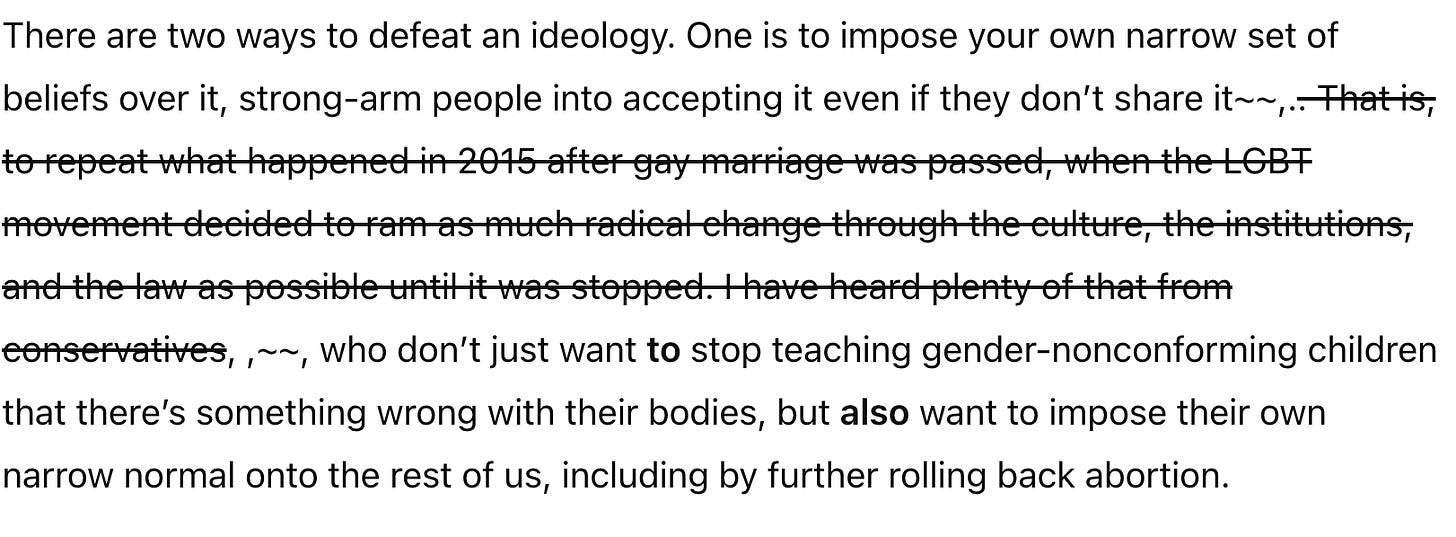 There are two ways to defeat an ideology. One is to impose your own narrow set of beliefs over it, strongarm people into accepting it even if they don’t share it,. That is: to repeat what happened in 2015 after gay marriage was passed and the LGBT brigade decided to ram as much radical change through the culture, the institutions, and the law as possible until it was stopped. I have heard plenty of that from conservatives, who don’t just want to stop teaching gender nonconforming children that there’s something wrong with their body, but impose their own narrow normal onto the rest of us, including further rolling back abortion.